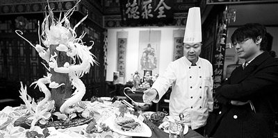 下图 在全聚德“百姓厨房”活动中,厨师在向宾客介绍具有异国风味的年夜饭菜品。 新华社记者 张旭摄