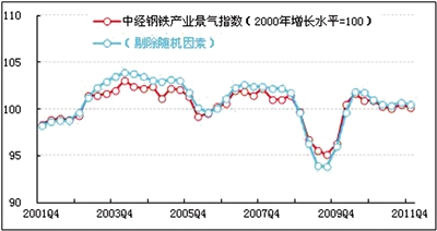 进一步剔除随机因素后,中经钢铁产业景气指数为100.5点(见中经钢铁产业景气走势图中的蓝色曲线),也较上季度降0.2点,但较未剔除随机因素的景气指数高0.2点,这表明钢铁产业自身仍具较强增长动力。