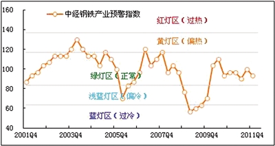 2011年四季度,中经钢铁产业景气指数为100.2点,较上季度略降0.2点;中经钢铁产业预警指数为93.3点,较上季度下降6.7点,仍在“绿灯区”内运行。本季度,钢铁产业面临的困难增多,下行压力加大。