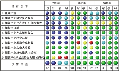 从灯号情况看,2011年四季度,在构成中经钢铁产业预警指数的10个指标(仅剔除季节因素,保留随机因素)中,位于“绿灯区”的有8个指标,位于“浅蓝灯区”的有2个指标——粗钢产量和钢铁产业税金总额。与上季度灯号图比较可以看出,本季度10个指标中有2个指标下降1个灯号,其余8个指标灯号不变。