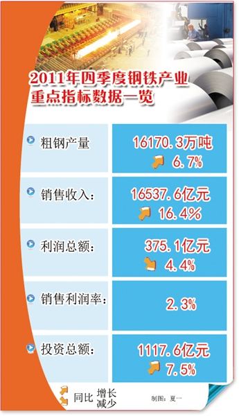 2011年下半年以来,由于受到钢铁下游产业市场需求明显弱化、大宗原燃料价格居高不下、市场供需矛盾日益突出等因素影响,钢铁产业生产经营难度加大。从四季度运行情况看,钢铁产业产销增速有所放缓,钢铁产业产品库存再度回升,钢铁产品价格大幅跳水,钢铁产业盈利状况持续处于微利水平,钢铁产业企业亏损总额进一步增加。