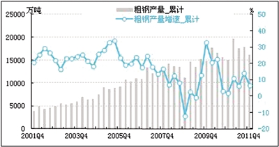 2011年四季度,装备、汽车、家电等下游用钢行业增长速度放缓,导致钢材需求增速减慢;另外,资金成本居高不下在一定程度上也对钢材的有效需求产生抑制作用,钢铁产业在本季度的产销增速明显放缓。