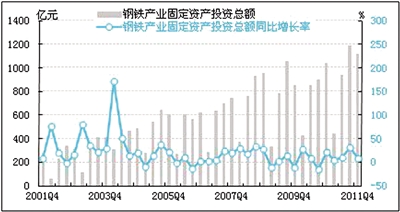 经初步季节调整,2011年四季度钢铁产业固定资产投资总额为1117.6亿元,同比增长7.5%,同比增速较上季度大幅下降23.8个百分点。