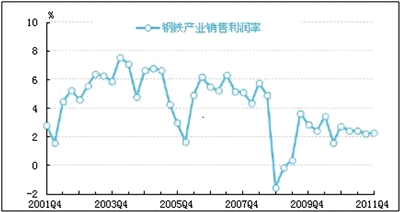 钢铁产业销售利润率仍处低位。2011年四季度,钢铁产业销售利润率为2.3%,较上季度略升0.1个百分点,远低于6.3%的全国工业销售利润率,钢铁产业盈利水平仍处于微利状态。预计钢铁行业这种微利运营状况在近期内可能很难有所改变。