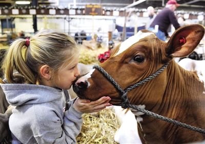 下图 1月中旬,在美国宾夕法尼亚州首府哈里斯堡市举行的第96届大型室内农业展上,一名名叫格雷西的女孩亲吻她喂养的奶牛。今年的农业展荟萃了6000多头家畜和290多个与农产品相关的农业展摊,吸引了全美各地40万观众参观。 (新华社发)