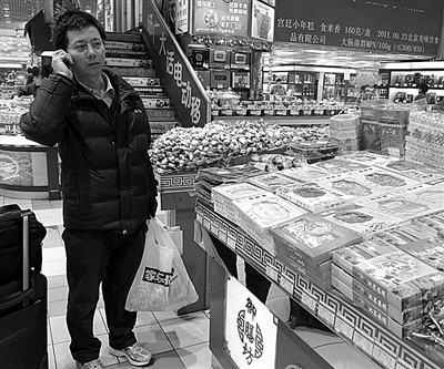 下图:在天津工作的黄理平,中午就要从北京坐火车回江西老家。他特意提前几个小时从天津赶到北京西单华威商场选购北京特产带回家乡。