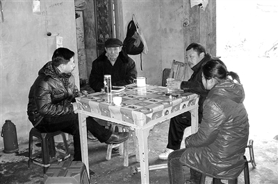 本报记者顾阳(左一)在江苏泗洪县瑶池乡西莫村村民万胜家采访。