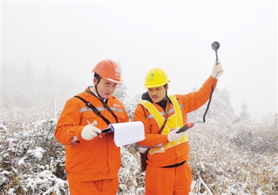 国家电网红岩供电抢修服务队的两名队员在重庆武隆县境内的高寒地区测量当地风速(1月20日摄)。 近日,为防范严寒天气导致的电网覆冰等供电隐患,国家电网红岩供电抢修服务队分赴仙女山、桐梓山、白马山等重庆高海拔覆冰地区执勤备战,确保电力生命线的畅通,保障群众在春节期间生产生活的正常进行。 新华社发