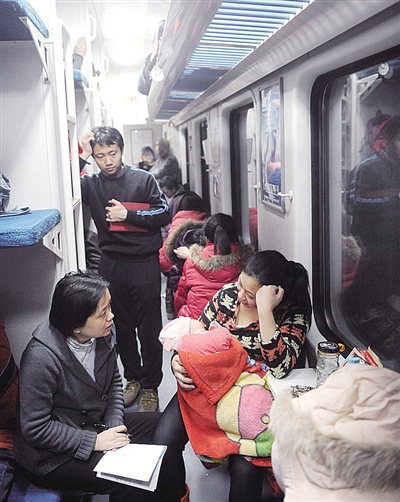 上图本报记者王晋(左)和张忱(中)正在列车上采访。