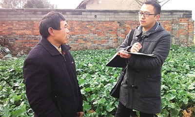下图在湖南省岳阳县筻口镇,本报记者喻剑(右)正在采访当地种粮大户。