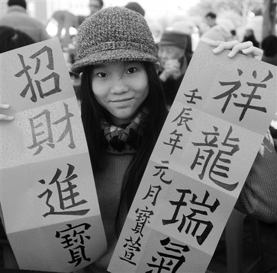 “2012新春开笔祈愿”活动在台北市中山堂前广场举行,约1200名市民与50余位书法家一起挥毫祈愿,表达新年的祝福与愿望。图为一名儿童展示他写下的祝福与愿望。 吴景腾摄(新华社发)