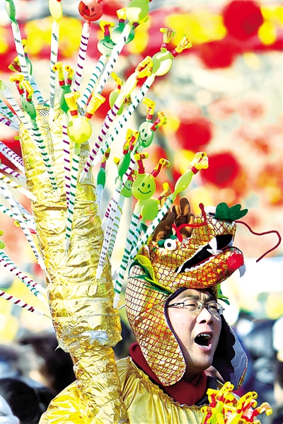 1月24日,一名戴着“龙头”棉帽的商贩在北京厂甸庙会上叫卖。在京城庙会上,人们以龙形服饰装扮成各式“龙人”,营造出浓浓的节日气氛。 赵 冰摄(新华社发)