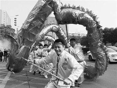 农历正月初一,南昌市街头的舞龙、舞狮表演赢得了市民的喝彩。 本报记者 赖永峰摄
