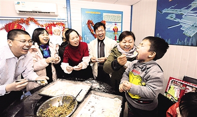 | 1月26日,北京地铁6号线施工工地,坚守工作岗位的中铁隧道集团部分职工与家属一起包饺子,度佳节。 |