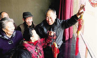 | 1月25日,辽宁盘锦市大洼县西安镇上口子村村民李万福(右一)家,老老少少齐聚一堂,贴窗花,吃饺子,过大年。 |