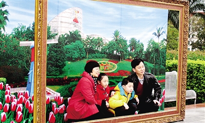 | 1月26日,广州市民黄先生一家来到广州云台公园,在新颖独特的花圃画框前拍摄春节全家福。 |
