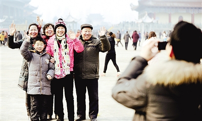 | 1月26日,河南汝阳庙会,柴豫老人(右一)一家三代合影留念。春节逛庙会,在当地是传统民俗。 |