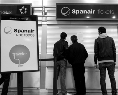 1月28日,乘客在西班牙马德里机场的“斯班航空”公司的客服窗口观看停飞告示。西班牙加泰罗尼亚自治区航空公司、星际联盟成员“斯班航空”因不堪债务拖累,于27日突然在其官方网站上宣布终止一切飞行,仅28日和29日两天,就有约2.27万名旅客及500余个航班受到影响,同时,该公司2000多名员工面临失业。 (新华社发)