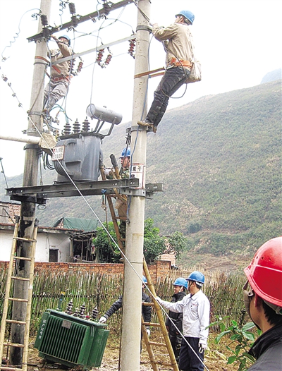 春节期间,广东连续遭到寒流袭击,气温明显下降,用电持续呈现高峰,为了保证居民家用电,广东清远连南供电局日夜加班。图为1月29日供电工作人员正在抢修线路。 本报记者 张 欣摄