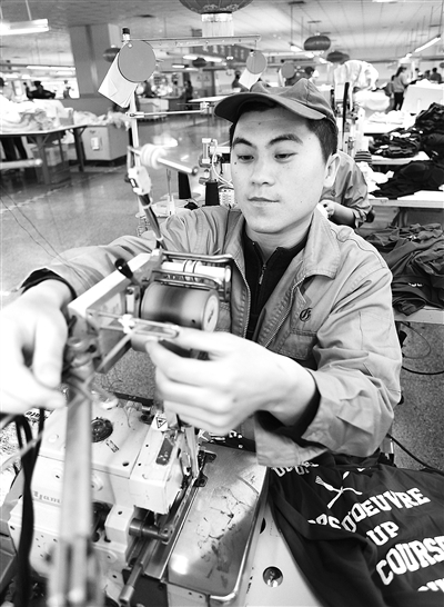 1月29日,22岁的男缝纫工曹功帅在青岛一家服装企业的生产线上工作。