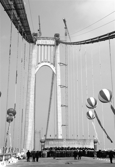1月31日,南京长江第四大桥合龙仪式在主桥南塔附近的桥面合龙处举行。 当日,目前国内跨径最大的双塔三跨悬索桥——南京长江第四大桥钢箱梁桥面合龙,大桥建设转入钢箱梁焊接、钢桥面铺装阶段,预计年底可建成通车。南京长江四桥总投资68.6亿元,项目全长近29公里,全线按双向六车道高速公路标准设计,其中跨江大桥长约5.5公里,主跨为1418米三跨吊悬索桥,共采用144节