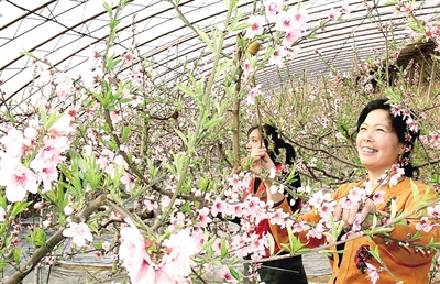 1月31日,河北省永清县韩村镇杨家营村绿野仙庄农业科技园里,两位果农在大棚里给桃花授粉。