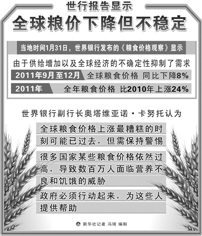 本报讯 记者连俊报道:世界银行最新发布的《食品价格观察》季度报告指出,由于供应增加和全球经济的不确定性,全球食品价格在2011年9月至12月期间下降了8%。报告预测,2012年世界食品价格有望继续下降。