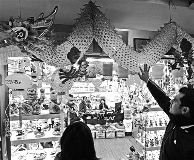 在浙江省义乌国际商贸城内的一家新春饰品商铺前,一位外商在欣赏一条中国龙吉祥物。
