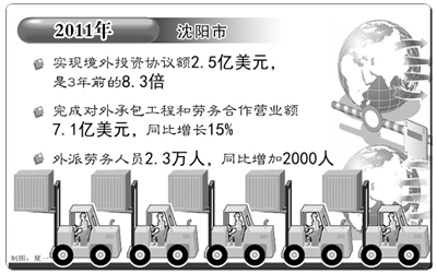本报讯 记者孙潜彤、通讯员傅淞岩报道:沈阳市大力实施“推动沈阳制造走出去”战略,取得显著成效。2011年沈阳市实现境外投资协议额2.5亿美元,是3年前的8.3倍;完成对外承包工程和劳务合作营业额7.1亿美元,同比增长15%;外派劳务人员2.3万人,同比增加2000人。这3项指标均创历史新高。