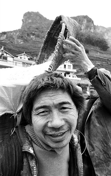 左图 2月1日,在水城县蟠龙乡木城村,农民余明达在装运材料进行危房改造。