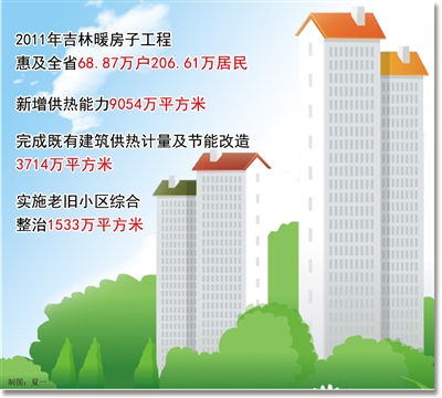 2011年,吉林省新增供热能力9054万平方米,完成既有建筑供热计量及节能改造3714万平方米,实施老旧小区综合整治1533万平方米,超额一倍完成年初制订的各项任务。全省68.87万户206.61万居民受益。群众称赞“暖房子工程不仅暖了房子,更暖了民心、解了民忧”。
