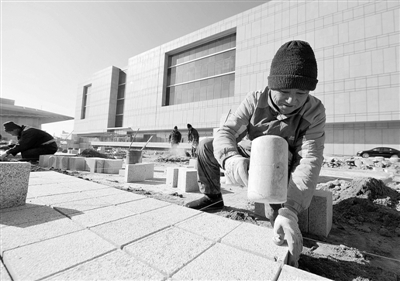 一名工作人员在铺设文化中心广场地砖(2月1日摄)。