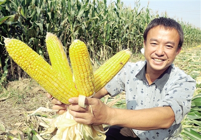 图为河北省新乐市承安镇凤鸣村农民高军峰展示丰收的玉米。河北新乐市对该市承安镇的凤鸣村、邯村、北坦村和承安铺4个村的5500亩中低产田进行改造,建成了旱能灌、涝能排的粮食高产稳产区,促进了农民增收。 贾敏杰摄(新华社发)