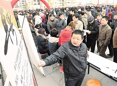 2月2日,一位工作人员在介绍自家的招聘信息。当日,安徽省合肥市包河区举办大型招聘会,服务当地因新城区建设被征地的农民。 新华社记者 郭 晨摄