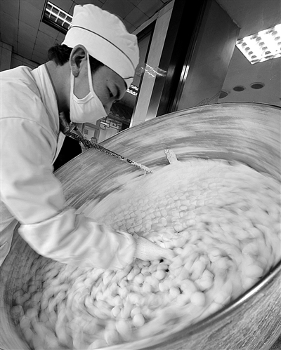 2月2日,一名工作人员在检查用圆形打制罐制作的元宵。随着农历元宵节的临近,天津市一食品有限公司的22家分店加班加点赶制元宵。新华社记者 岳月伟摄