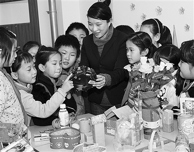 右图 高新区小学的学生们在“低碳生活,变废为宝”手工制作活动中,利用生活废弃物开展小发明制作。