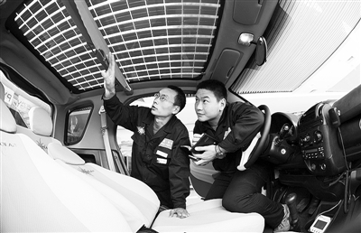 “低碳”正渗透到保定城市经济发展、市政建设、百姓生活等各个领域。 图为英利光伏应用技术研究院自主研发的全球第一块双曲面车顶用光伏电池板。