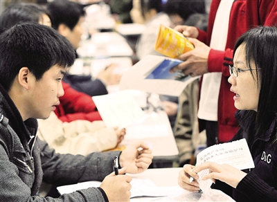 2月1日,一名求职者(右)在广州市人力资源市场中心和用人单位代表洽谈。当日,广州市人力资源市场举行广州市“春风行动2012”促进外来务工人员就业首场专场招聘会。 新华社记者 陈晔华摄