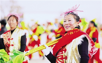 2月5日,宁夏中宁县余丁乡黄羊村农民刘永凤参加县里举办的元宵节社火展演。