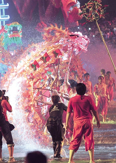 上图 2月3日,在新加坡“妆艺大游行”中,表演者在水道上舞龙。今年的“妆艺大游行”首次在一条特制的水道上举行,数千人的游行队伍和花车从没过脚踝的浅水中经过,别有一番乐趣和风情。 新华社发