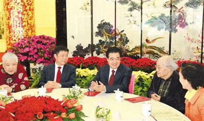 人民大会堂金色大厅里华灯璀璨,鲜花芬芳,涌动着浓浓春意。19时45分许,胡锦涛等党和国家领导人在欢快的乐曲声中步入大厅,来到文艺、科技、教育、理论、新闻出版等知识界代表中间,同他们亲切握手、互致问候。