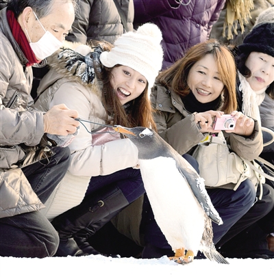 下图 2月初,在日本北海道旭川市的朝日山动物园,一只企鹅在雪地里“散步”时衔住一名游客的相机绳。每到寒冬时节,这家动物园的企鹅就会集体出门“散步”。 新华社发