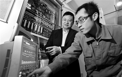 广东易事特电源股份有限公司董事长何思模教授(左)和研发人员杨国一起对公司自主设计研发的500千瓦光伏并网逆变器进行研发调试。该公司掌握了整个光伏产业链最核心和效益最大化的光伏并网发电技术,从而在竞争激烈的光伏产业里,成功登上金字塔的顶端。 新华社记者 刘大伟摄