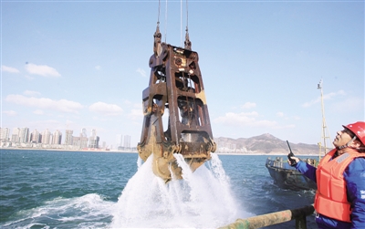 2月8日,在大连南部滨海大道跨海大桥建设工地上,工人在进行沉箱基槽挖掘作业。