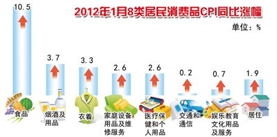 食品价格上涨是推高1月份CPI的主要因素。统计数据显示,1月份,食品价格同比上涨10.5%,影响居民消费价格总水平上涨约3.29个百分点。食品价格上涨加快的主要原因是2012年春节在1月份,元旦、春节等季节性因素叠加,极大地带动了居民消费量,推高了物价总水平。