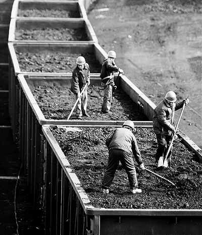 2月8日,工人们在江西九江北火车站煤炭装车点装运电煤。针对江西省近期持续低温、电煤和取暖用煤供应紧张状况,连日来,南昌铁路局和上海国际港务集团加强组织协调,确保电煤运输安全畅通。 胡国林摄(新华社发)