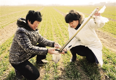 2月10日,原阳县农业土肥站的农艺师王彦芳(右)在田间取土采样,指导农民配方施肥。时下正是春耕备播和田间管理的关键时期,黄河岸边的河南省原阳县农民正抓紧对农作物进行施肥、灌溉,为农业丰收打下良好基础。 新华社记者 朱 祥摄