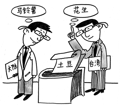 如果你是大陆居民,如果你在台湾旅游,有人问你“土豆”是什么?绝大多数人一定会毫不犹豫地脱口而出:“马铃薯。”但是,错!在台湾,“土豆”指的是“花生”。类似的例子在两岸的语言文字使用中还有很多,现在,两岸的专家学者们正在将这些语言中的分歧加以全面整合处理,以达到化异为通的目的。