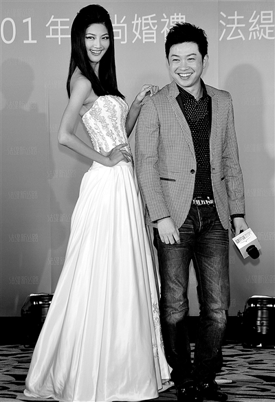 2月9日,台湾模特吴宜桦(左)与法缇·新丝路婚礼品牌总监李明川出席活动。 当日,新丝路模特经纪公司与台湾法堤婚礼公司在台北正式结盟,台湾法堤更名为“法缇·新丝路”,打造集彩妆、造型、走秀为一体的婚礼服务品牌。预计“法缇·新丝路”今年7月在湖南长沙开设在大陆的第一家分店。 新华社发