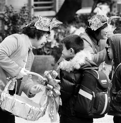 上图:2月8日,台北市教育大学附属小学的老师戴着头饰迎接学生。 当日是台北市教育大学附属小学开学的日子。 新华社发